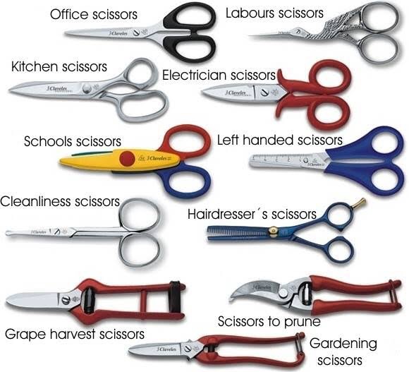 There are different kinds of scissors depending on the intended use of the tool. As scissors are not only limited to cloth making but are used for other various purposes, the shape and sharpness of the tool varies to match its intended use. There are gardening scissors use to prune plants in the garden, kitchen scissors for cutting some ingredients or sachets, electrician scissors for cables and copper wires, hairdressers scissors for cutting and trimming hair and beards, grape harvest scissors for harvesting grapes in a vine, school scissors that cuts papers designed with blunt or zig-zag blades that won’t harm kids and many other types of purposeful scissors. There is even left-handed scissors tailored to be used easily with left hands 🙂