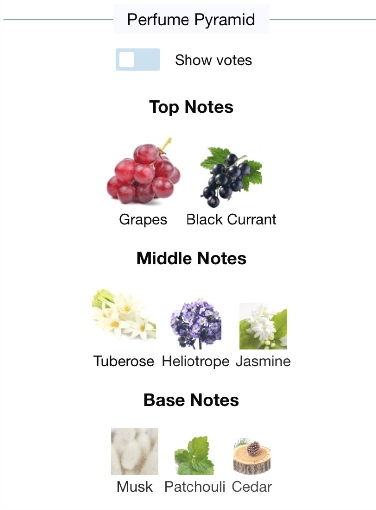 It is a floral, fruity oriental fragrance and I am using these three notes to explain its scent because that is how the perfume opens throughout its stay. On the top notes comes the fruity scents of grapes and black currant, and this gives way 10-15minutes after it has settled down to floral middle notes of tuberose, heliotrope and jasmine. The scent only gets better as the oriental base notes come to life at the end of the perfume with musk, cedar and patchouli.