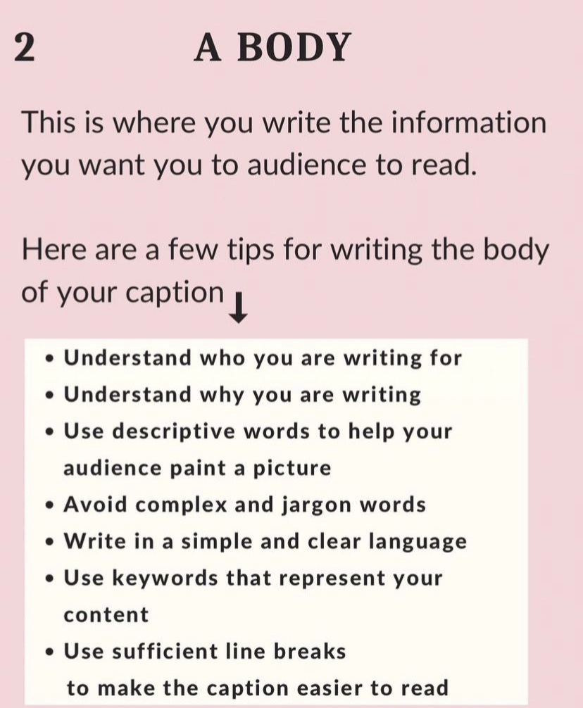There are short captions. This is usually a quote, set of emojis or quick sentence. Then mid-length captions. This can be used for sales content or humorous contentsThen there are long captions. This is the type of captions that are stories, most times its hard to get people to read them if they are not intensely captivating.