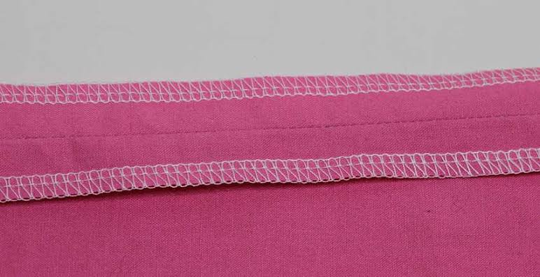 This seam finish is done on a Serger. A serger encloses the edge of the fabric inside a thread casing. It adds strength to the seams. If this seam finish is applied to your home-sewn garment, it will look like it is manufactured rather than handmade. This edge finish can be applied before or after sewing the seam. To sew this finish, keep the fabric to the left of the needles and serge along the fabric edge. The thread will wrap the raw edge in a way that neatly finishes it.