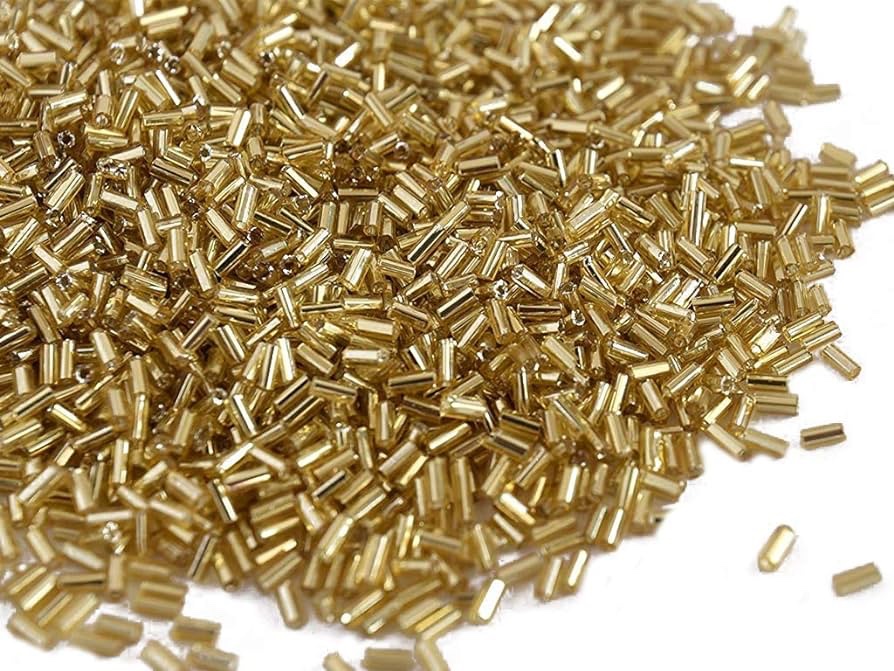 4. Glass Beads: These beads are also called broken glass beads, rice beads or bugle beads depending on your location. They mostly have a clear color and and look like broken shards of glass, hence the name. They are elongated cylindrical beads that look like individual grains of rice. The rice shape makes it attractive to use. They are great to be used with linear stitches. They come in various colors, length and sizes too.
